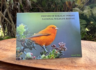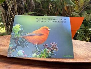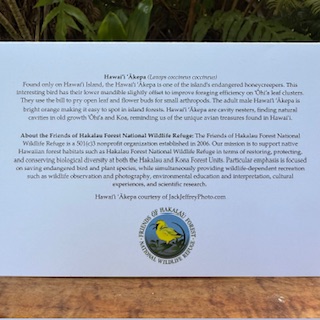 High Quality Greeting Cards. This stunning Jack Jeffrey photograph features the incredible Hawai‘i ‘ākepa in it’s natural habitat. Printed on high quality glossy paper, these attractive cards are appropriate for any occasion. The card includes a description of Hawaii’s endangered honeycreepers and the Friends of Hakalau Forest National Wildlife Refuge. Blank inside.